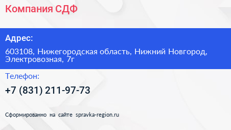 Компания СДФ по адресу 603108, Нижегородская область, Нижний Новгород, Электровозная, 7г в дальнейшем Организация, размещена в следующих категориях: