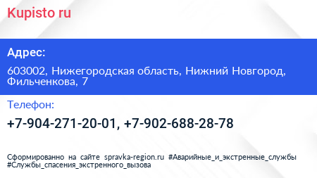 Kupisto.ru по адресу 603002, Нижегородская область, Нижний Новгород, Фильченкова, 7 в дальнейшем Организация, размещена в следующих категориях: