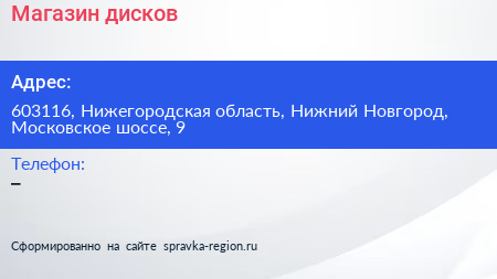 Магазин дисков по адресу 603116, Нижегородская область, Нижний Новгород, Московское шоссе, 9 в дальнейшем Организация, размещена в следующих категориях: