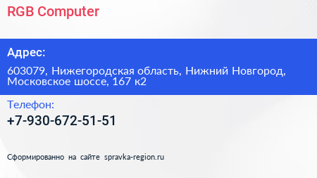 RGB Computer по адресу 603079, Нижегородская область, Нижний Новгород, Московское шоссе, 167 к2 в дальнейшем Организация, размещена в следующих категориях: