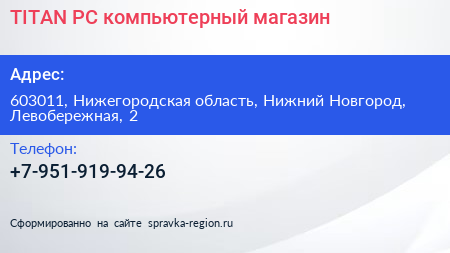 TITAN PC, компьютерный магазин по адресу 603011, Нижегородская область, Нижний Новгород, Левобережная, 2 в дальнейшем Организация, размещена в следующих категориях: