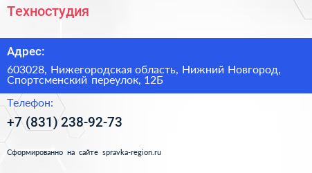 Техностудия по адресу 603028, Нижегородская область, Нижний Новгород, Спортсменский переулок, 12Б в дальнейшем Организация, размещена в следующих категориях:
