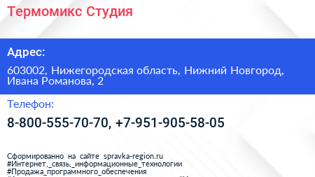Термомикс Студия по адресу 603002, Нижегородская область, Нижний Новгород, Ивана Романова, 2 в дальнейшем Организация, размещена в следующих категориях: