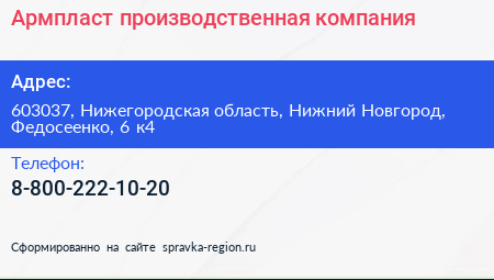 Армпласт, производственная компания по адресу 603037, Нижегородская область, Нижний Новгород, Федосеенко, 6 к4 в дальнейшем Организация, размещена в следующих категориях: