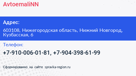 AvtoemaliNN по адресу 603108, Нижегородская область, Нижний Новгород, Кузбасская, 6 в дальнейшем Организация, размещена в следующих категориях: