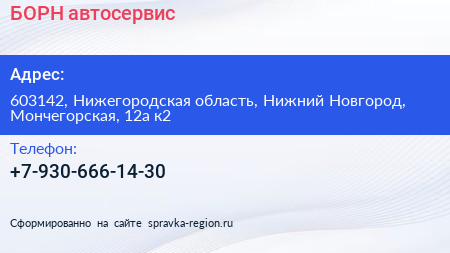 БОРН, автосервис по адресу 603142, Нижегородская область, Нижний Новгород, Мончегорская, 12а к2 в дальнейшем Организация, размещена в следующих категориях: