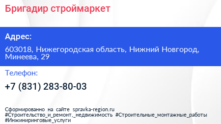 Бригадир, строймаркет по адресу 603018, Нижегородская область, Нижний Новгород, Минеева, 29 в дальнейшем Организация, размещена в следующих категориях:
