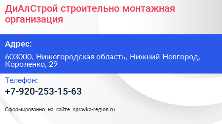 ДиАлСтрой, строительно-монтажная организация по адресу 603000, Нижегородская область, Нижний Новгород, Короленко, 29 в дальнейшем Организация, размещена в следующих категориях:
