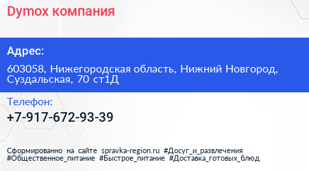 Dymox, компания по адресу 603058, Нижегородская область, Нижний Новгород, Суздальская, 70 ст1Д в дальнейшем Организация, размещена в следующих категориях: