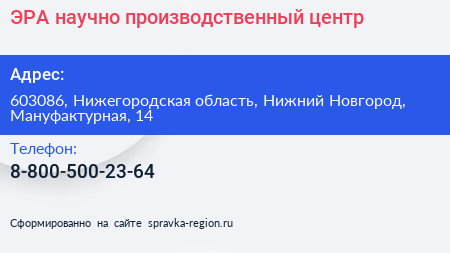 ЭРА, научно-производственный центр по адресу 603086, Нижегородская область, Нижний Новгород, Мануфактурная, 14 в дальнейшем Организация, размещена в следующих категориях:
