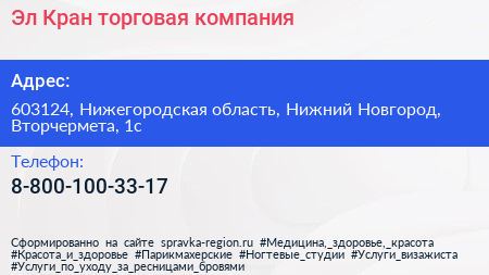 Эл-Кран, торговая компания по адресу 603124, Нижегородская область, Нижний Новгород, Вторчермета, 1с в дальнейшем Организация, размещена в следующих категориях: