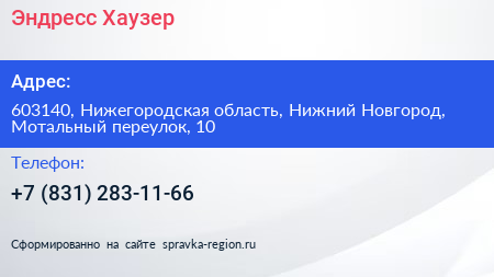 Эндресс+Хаузер по адресу 603140, Нижегородская область, Нижний Новгород, Мотальный переулок, 10 в дальнейшем Организация, размещена в следующих категориях:
