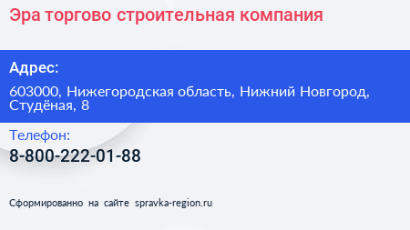 Эра, торгово-строительная компания по адресу 603000, Нижегородская область, Нижний Новгород, Студёная, 8 в дальнейшем Организация, размещена в следующих категориях: