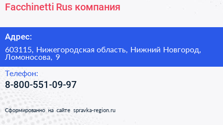 Facchinetti Rus, компания по адресу 603115, Нижегородская область, Нижний Новгород, Ломоносова, 9 в дальнейшем Организация, размещена в следующих категориях: