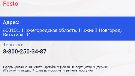Festo по адресу 603101, Нижегородская область, Нижний Новгород, Ватутина, 11 в дальнейшем Организация, размещена в следующих категориях: