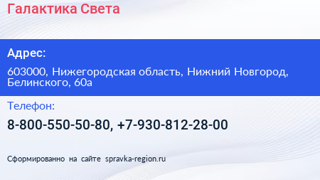Галактика Света по адресу 603000, Нижегородская область, Нижний Новгород, Белинского, 60а в дальнейшем Организация, размещена в следующих категориях: