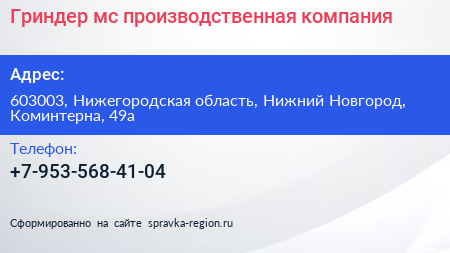 Гриндер-мс, производственная компания по адресу 603003, Нижегородская область, Нижний Новгород, Коминтерна, 49а в дальнейшем Организация, размещена в следующих категориях: