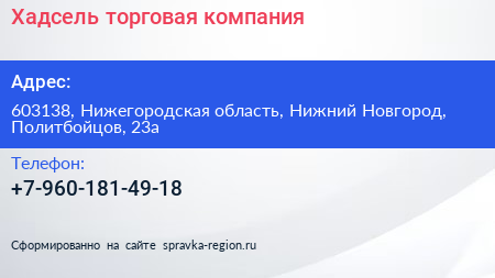 Хадсель, торговая компания по адресу 603138, Нижегородская область, Нижний Новгород, Политбойцов, 23а в дальнейшем Организация, размещена в следующих категориях: