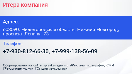 Итера, компания по адресу 603090, Нижегородская область, Нижний Новгород, проспект Ленина, 73 в дальнейшем Организация, размещена в следующих категориях: