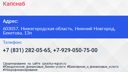 Капснаб по адресу 603057, Нижегородская область, Нижний Новгород, Бекетова, 13п в дальнейшем Организация, размещена в следующих категориях: