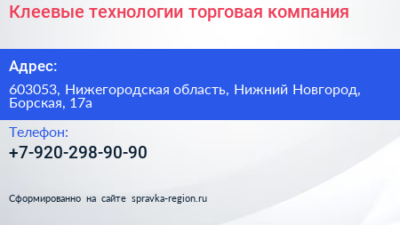 Клеевые технологии, торговая компания по адресу 603053, Нижегородская область, Нижний Новгород, Борская, 17а в дальнейшем Организация, размещена в следующих категориях:
