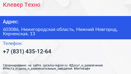 Клевер Техно по адресу 603086, Нижегородская область, Нижний Новгород, Керченская, 13 в дальнейшем Организация, размещена в следующих категориях: