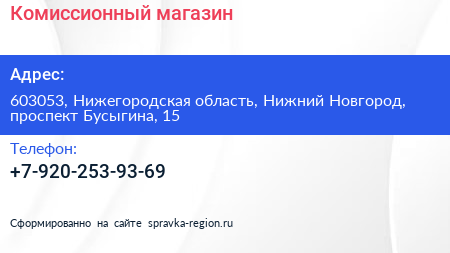 Комиссионный магазин по адресу 603053, Нижегородская область, Нижний Новгород, проспект Бусыгина, 15 в дальнейшем Организация, размещена в следующих категориях: