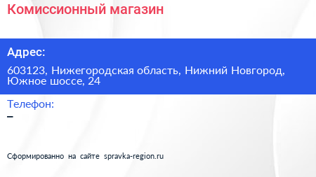 Комиссионный магазин по адресу 603123, Нижегородская область, Нижний Новгород, Южное шоссе, 24 в дальнейшем Организация, размещена в следующих категориях: