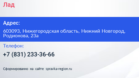 Лад по адресу 603093, Нижегородская область, Нижний Новгород, Родионова, 23а в дальнейшем Организация, размещена в следующих категориях: