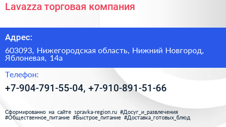 Lavazza, торговая компания по адресу 603093, Нижегородская область, Нижний Новгород, Яблоневая, 14а в дальнейшем Организация, размещена в следующих категориях: