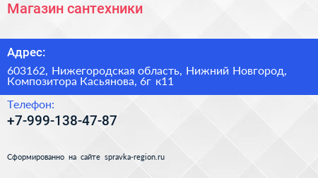 Магазин сантехники по адресу 603162, Нижегородская область, Нижний Новгород, Композитора Касьянова, 6г к11 в дальнейшем Организация, размещена в следующих категориях: