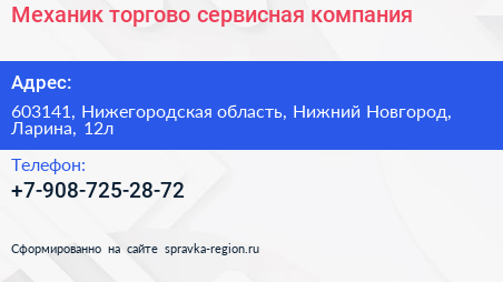 Механик, торгово-сервисная компания по адресу 603141, Нижегородская область, Нижний Новгород, Ларина, 12л в дальнейшем Организация, размещена в следующих категориях: