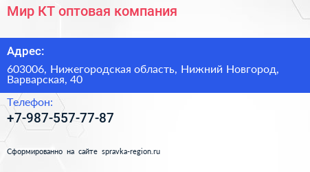 Мир КТ, оптовая компания по адресу 603006, Нижегородская область, Нижний Новгород, Варварская, 40 в дальнейшем Организация, размещена в следующих категориях: