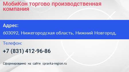 МобиКон, торгово-производственная компания по адресу 603092, Нижегородская область, Нижний Новгород, в дальнейшем Организация, размещена в следующих категориях: