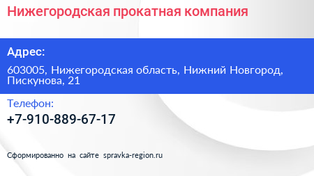Нижегородская прокатная компания по адресу 603005, Нижегородская область, Нижний Новгород, Пискунова, 21 в дальнейшем Организация, размещена в следующих категориях: