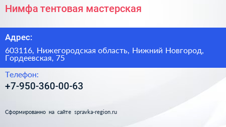 Нимфа, тентовая мастерская по адресу 603116, Нижегородская область, Нижний Новгород, Гордеевская, 75 в дальнейшем Организация, размещена в следующих категориях: