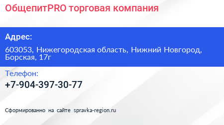 ОбщепитPRO, торговая компания по адресу 603053, Нижегородская область, Нижний Новгород, Борская, 17г в дальнейшем Организация, размещена в следующих категориях: