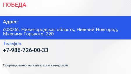 ПОБЕДА по адресу 603006, Нижегородская область, Нижний Новгород, Максима Горького, 220 в дальнейшем Организация, размещена в следующих категориях: