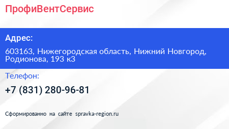 ПрофиВентСервис по адресу 603163, Нижегородская область, Нижний Новгород, Родионова, 193 к3 в дальнейшем Организация, размещена в следующих категориях: