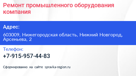 Ремонт промышленного оборудования, компания по адресу 603009, Нижегородская область, Нижний Новгород, Арсеньева, 2 в дальнейшем Организация, размещена в следующих категориях: