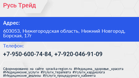 Русь Трейд по адресу 603053, Нижегородская область, Нижний Новгород, Борская, 17г в дальнейшем Организация, размещена в следующих категориях: