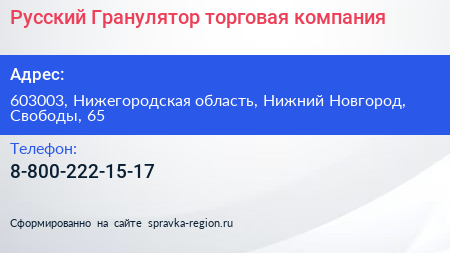 Русский Гранулятор, торговая компания по адресу 603003, Нижегородская область, Нижний Новгород, Свободы, 65 в дальнейшем Организация, размещена в следующих категориях: