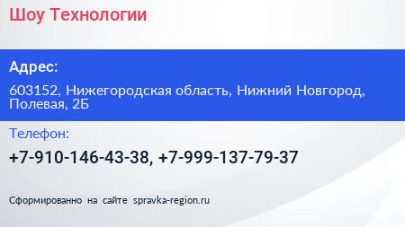 Шоу Технологии по адресу 603152, Нижегородская область, Нижний Новгород, Полевая, 2Б в дальнейшем Организация, размещена в следующих категориях: