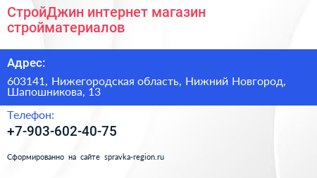 СтройДжин, интернет-магазин стройматериалов по адресу 603141, Нижегородская область, Нижний Новгород, Шапошникова, 13 в дальнейшем Организация, размещена в следующих категориях:
