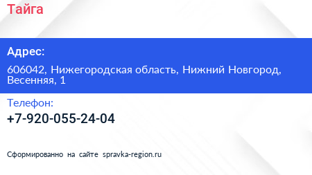 Тайга по адресу 606042, Нижегородская область, Нижний Новгород, Весенняя, 1 в дальнейшем Организация, размещена в следующих категориях: