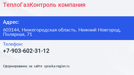 ТеплоГазКонтроль, компания по адресу 603144, Нижегородская область, Нижний Новгород, Полярная, 71 в дальнейшем Организация, размещена в следующих категориях: