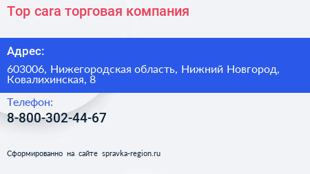 Top-cara, торговая компания по адресу 603006, Нижегородская область, Нижний Новгород, Ковалихинская, 8 в дальнейшем Организация, размещена в следующих категориях: