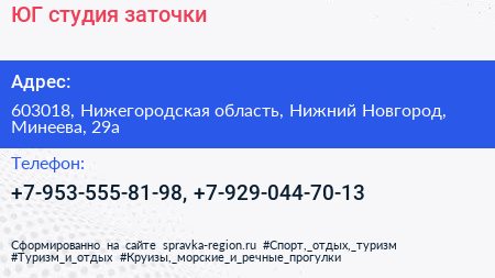 ЮГ, студия заточки по адресу 603018, Нижегородская область, Нижний Новгород, Минеева, 29а в дальнейшем Организация, размещена в следующих категориях: