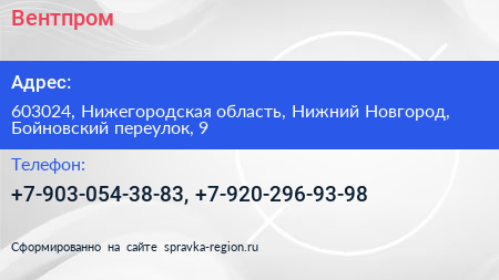 Вентпром по адресу 603024, Нижегородская область, Нижний Новгород, Бойновский переулок, 9 в дальнейшем Организация, размещена в следующих категориях: