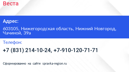 Веста по адресу 603105, Нижегородская область, Нижний Новгород, Чачиной, 39а в дальнейшем Организация, размещена в следующих категориях: